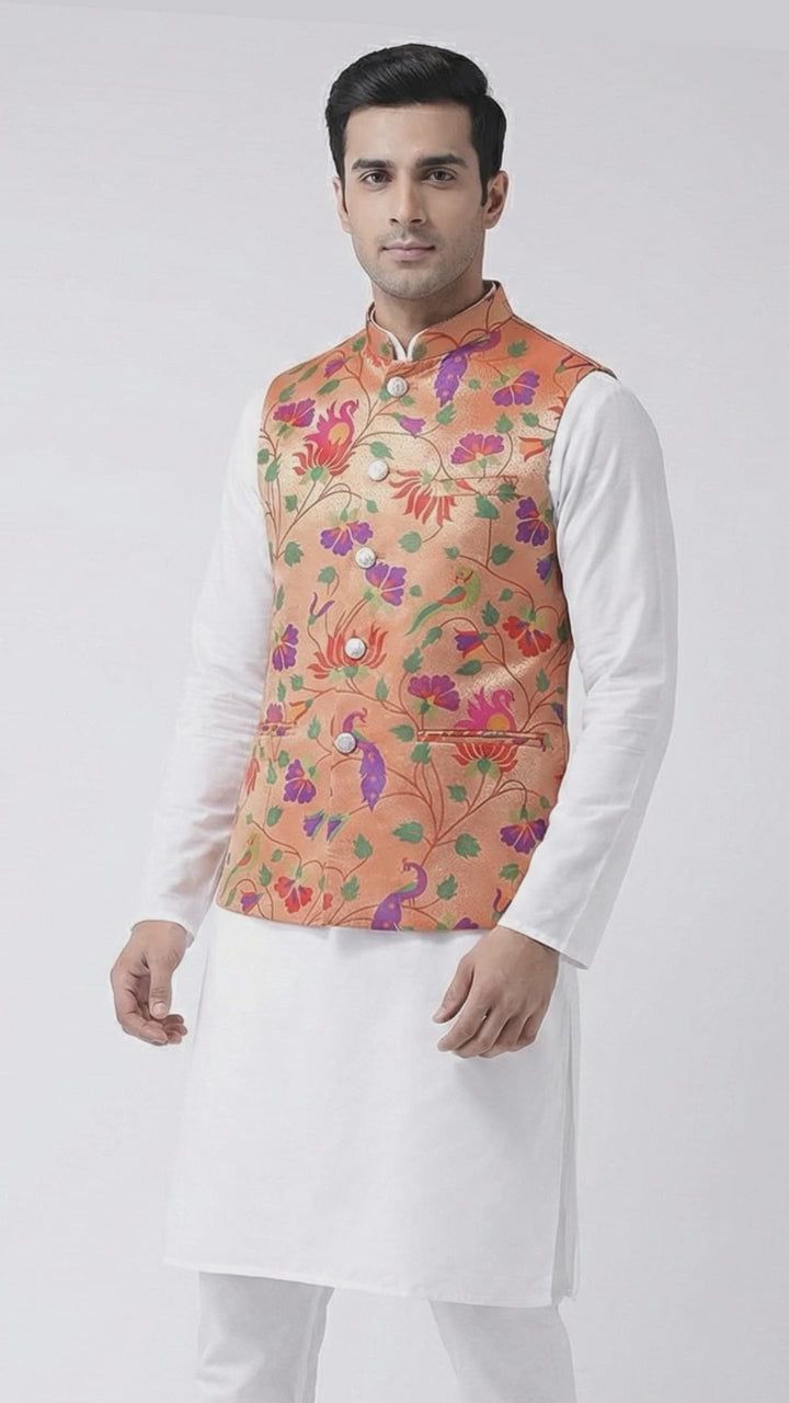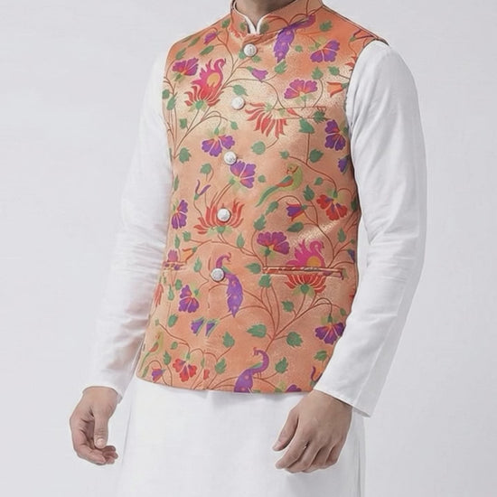 Upgrade your ethnic look with this elegant Paithani jacket for men. Crafted from rich paithani silk in a golden shade, it features vibrant floral and peacock motifs inspired by traditional Paithani weaving. Perfect for weddings, festivals, and cultural events.