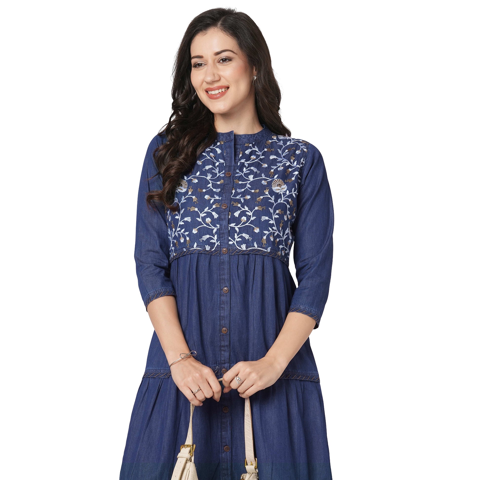 - Pleasant look, Soft denim, we craeted fusion. Kashmiri work on denim. Very comfortable. Casual wear, party wear.