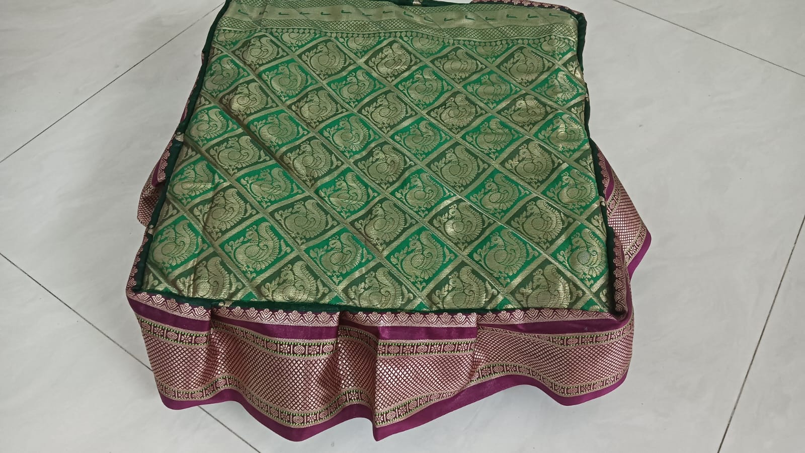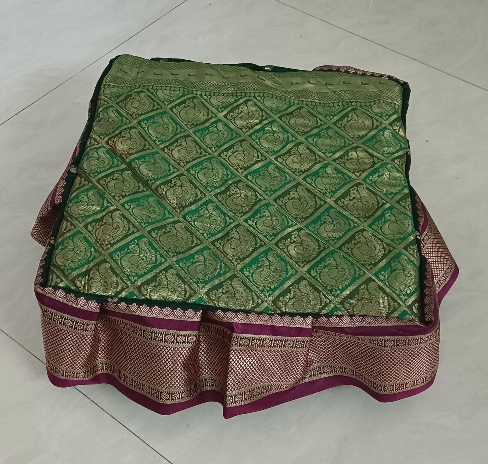 Fabric - Silk jari woven peacock all over Size - 15*15. Please measure the length and width of your chowki and then place an order this will help you for getting exact size